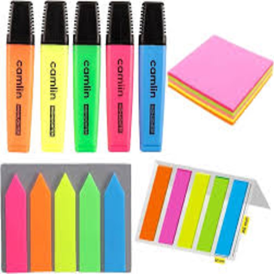 A set of 5 vibrant highlighters in assorted fluorescent colours — Yellow, Pink, Orange, Green, and Blue — with chisel tips for both broad highlighting and fine underlining. The bright, non‑toxic ink dries quickly, resists smudging, and makes important text stand out clearly, ideal for students, professionals, and everyday use.