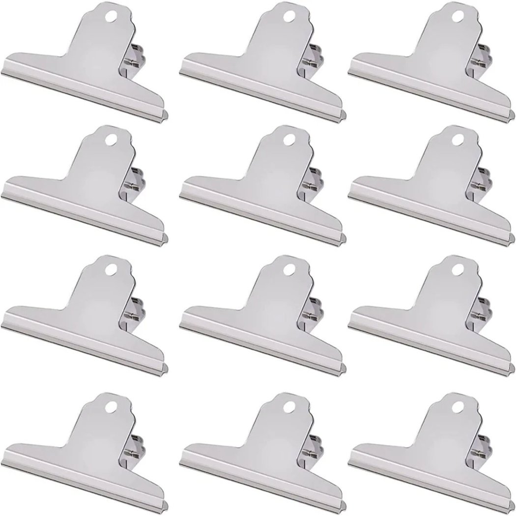 A set of 12 medium‑sized steel clips designed to securely hold stacks of paper, documents, receipts, and files. Made from durable metal with a strong grip, these clips help keep paperwork organized and tidy — ideal for office, school, and home stationery use.
